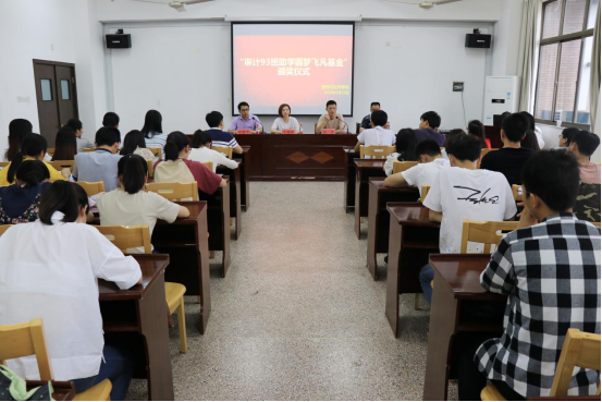 5月22日下午,管理与经济学院在主教学楼1009举行“审计93班助学圆梦飞凡基金”颁奖仪式。审计93班校友代表、百拙坊财务总监高亮、校学工部(处)副部(处)长王晓丽、管理与经济学院党总支副书记宋俊杰、审计93班班主任欧阳春出席颁奖仪式并为获奖学生颁奖,师生代表百余人到场。本次颁奖仪式由党总支副书记宋俊杰主持。