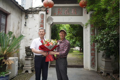 梅仕灿向老艺术家校友黄云鹏送上鲜花